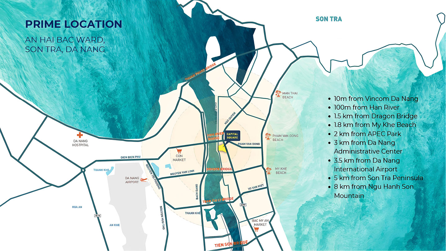 Nằm trên trục đường Trần Hưng Đạo ven sông Hàn, giữa hai cây cầu biểu tượng là cầu Rồng và cầu Sông Hàn, đối diện chợ Hàn – Capital Square sở hữu vị trí không thể thay thế, giá trị ngày càng tăng theo thời gian.